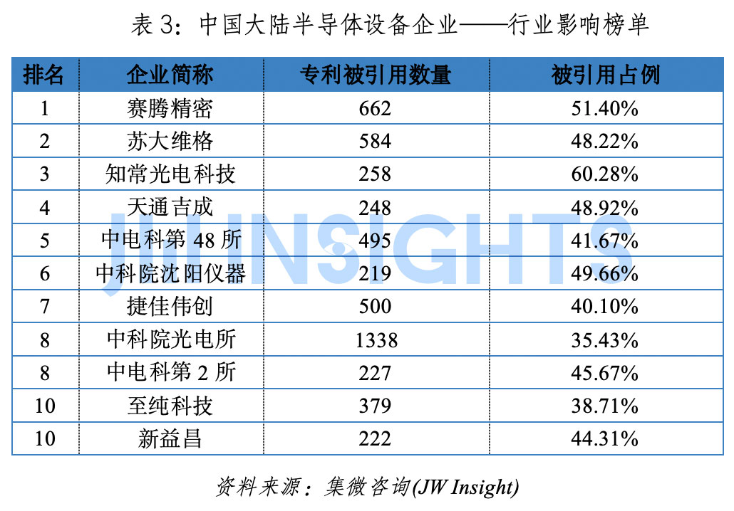 以专利被引用情况作为企业的技术对行业技术的贡献大小的参照。专利被引用的情况包括被其他专利文献公开引用,或在其他专利的实质审查程序中审查员将本专利文献作为对比文献在通知书或检索报告中引用。专利被引用数量的多少和专利被引用占比的高低可以反映出企业披露的专利对应的技术方案的研究热度和业内关注活跃度,侧面反映出企业专利的技术先进性和对行业的贡献程度。爱集微知识产权基于各企业被引用专利数量和被引用专利占比的合理权重,生成行业影响力得分,并发布中国大陆半导体设备领域企业专利行业影响榜单TOP10。