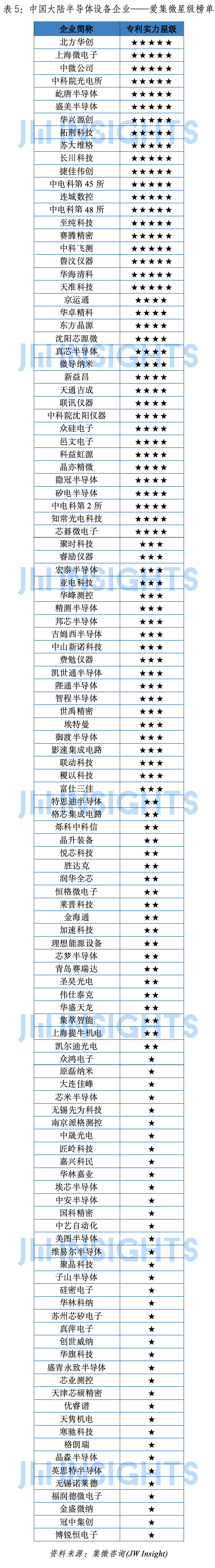 最后,爱集微知识产权咨询针对中国大陆半导体设备企业,在综合考虑专利数量、发明专利占比、授权专利与有效专利占比、专利海外布局、被引用比例、专利诉讼、专利转让、专利许可、专利质押、专利撰写水准等指标,进行专利实力星级评价,结果如下。