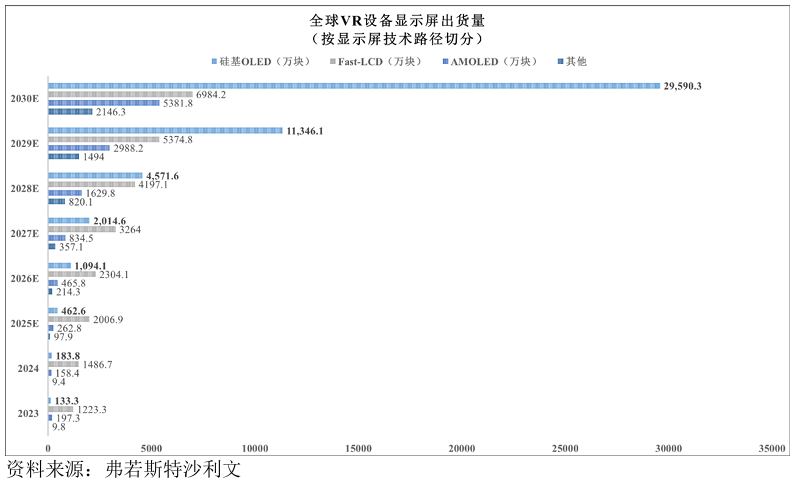 其中VR与AR市场的表现尤为亮眼:2024年应用于VR设备的硅基OLED出货量为183.8万块,预计2030年将达29590.3万块,年复合增长率133.2%;而AR设备中硅基OLED的渗透率已达80.8%,2024年出货量约99.9万台,成为产业主流显示技术。
