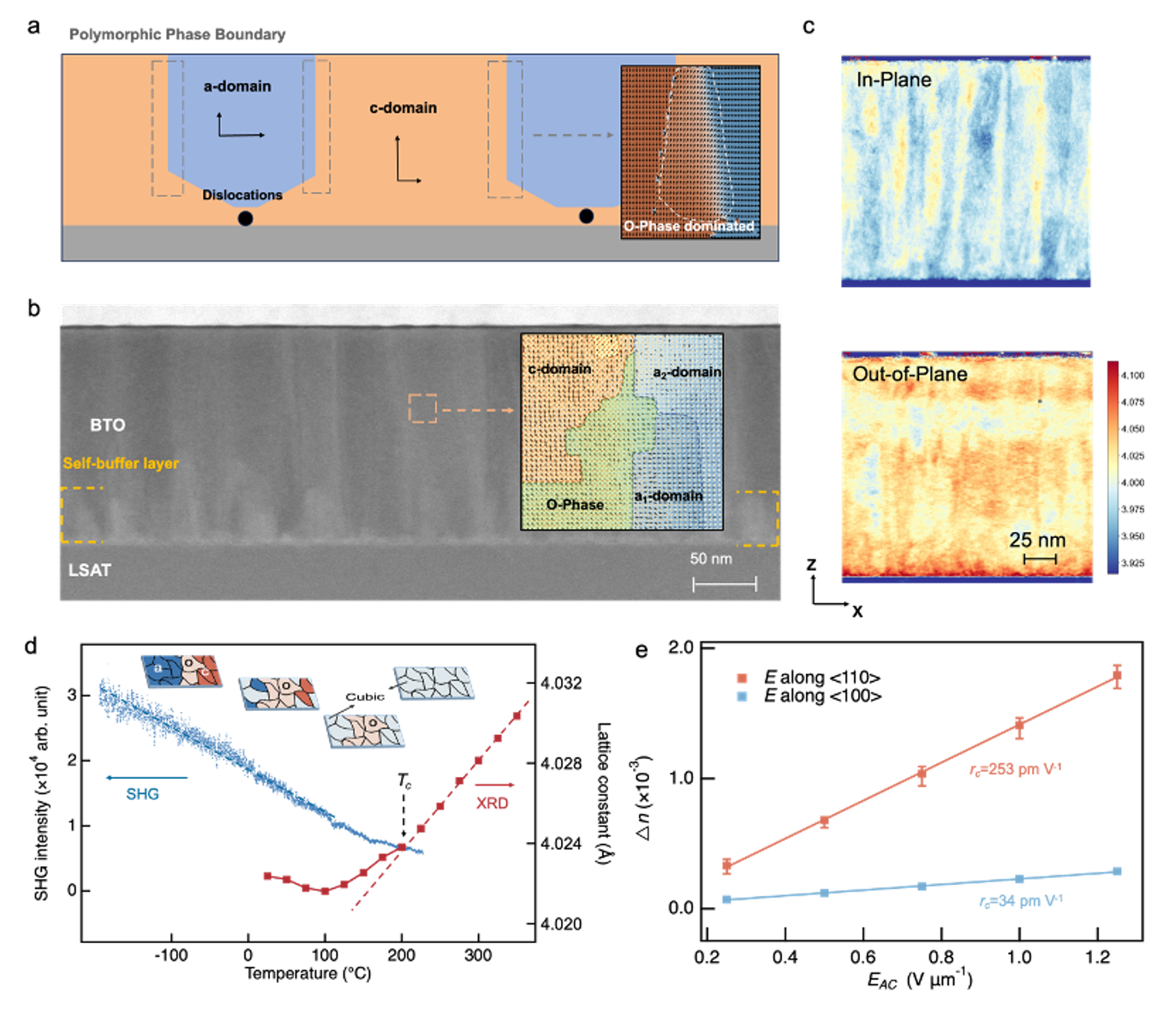 这一材料设计策略利用BaTiO3与LSAT之间的晶格失配,通过控制沉积工艺在薄膜生长初期形成自缓冲层,其中包括周期性位错成核位点,进而诱导上层薄膜产生横向周期性应变调制。电镜表征和相场模拟表明,这一应变状态可以稳定出多相畴结构,在畴壁附近形成过渡区,其中包含正交相和四方相的极化纳米区域。这一结构特征类似铁电材料中的多晶型相界效应,四方相与正交相的耦合作用促进局部极化旋转,从而增强了薄膜电光响应。基于Sénarmont方法的电光测试显示,薄膜在[110]方向面内电场下的有效线性电光系数高达253pm/V,相较于常规的BaTiO3/LSAT薄膜提升了约45%。此外,上述多相畴结构展现出较高的结构鲁棒性和热稳定性,将薄膜的居里温度提高至200°C。这对改善BaTiO3薄膜的微纳工艺兼容性具有重要意义。