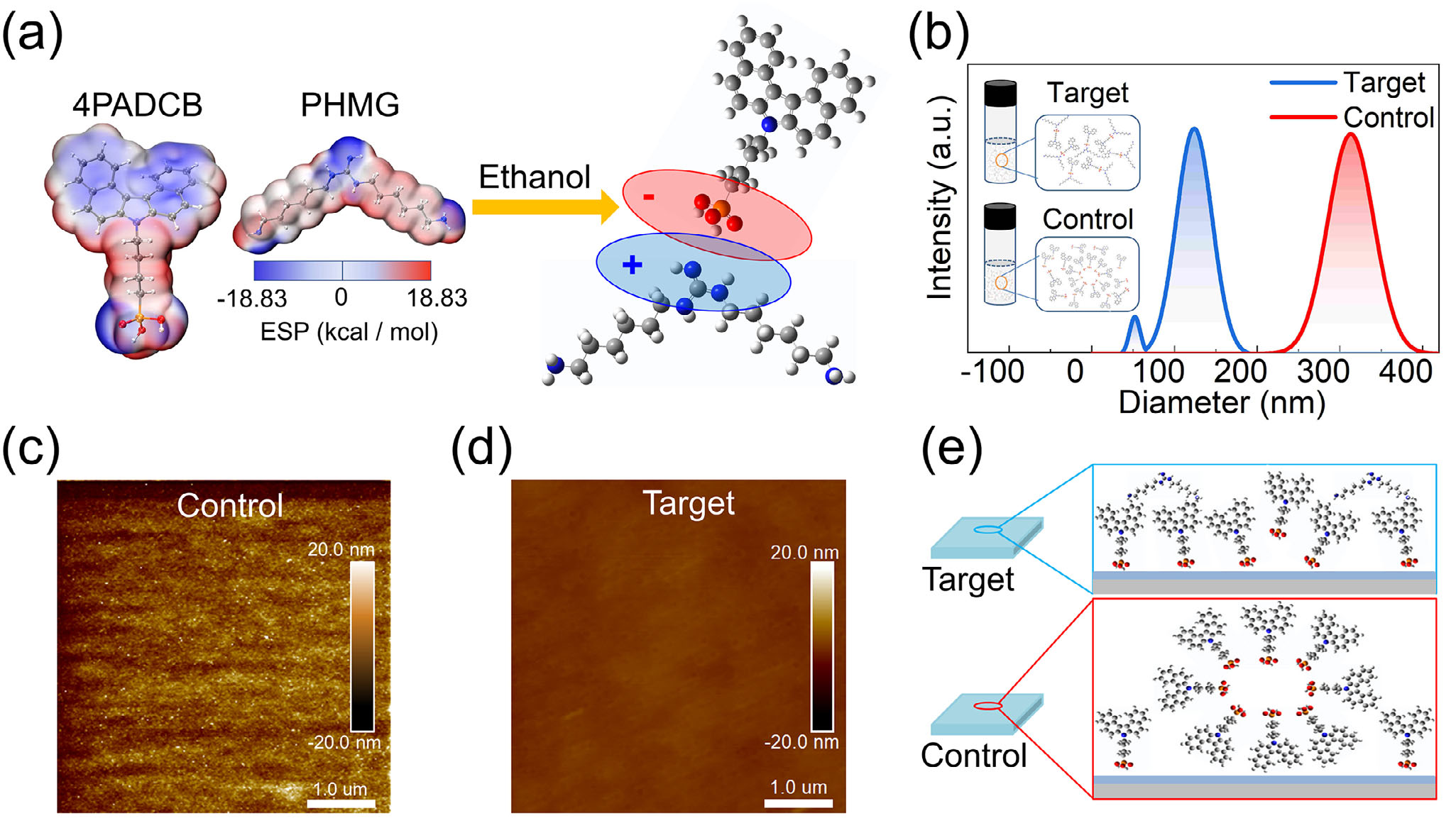 图1. 胍基诱导自组装单分子层静电作用示意及表征