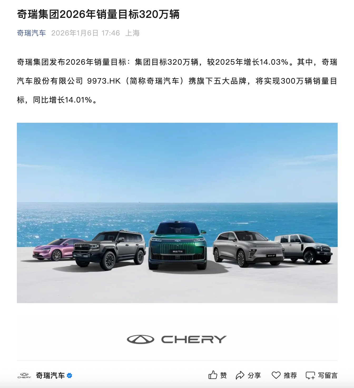 1月6日,奇瑞集团发布2026年销量目标:集团目标320万辆,较2025年增长14.03%。其中,奇瑞汽车股份有限公司9973.HK(简称奇瑞汽车)携旗下五大品牌,将实现300万辆销量目标,同比增长14.01%。