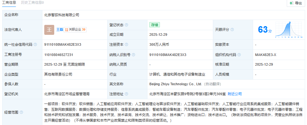 天眼查显示,北京智驭科技有限公司于2025年12月29日成立,注册资本为300万元,主要经营业务包括人工智能应用软件开发、人工智能基础软件开发、人工智能行业应用系统集成服务、智能车载设备制造、汽车零配件批发、汽车零配件零售、电子元器件批发等。