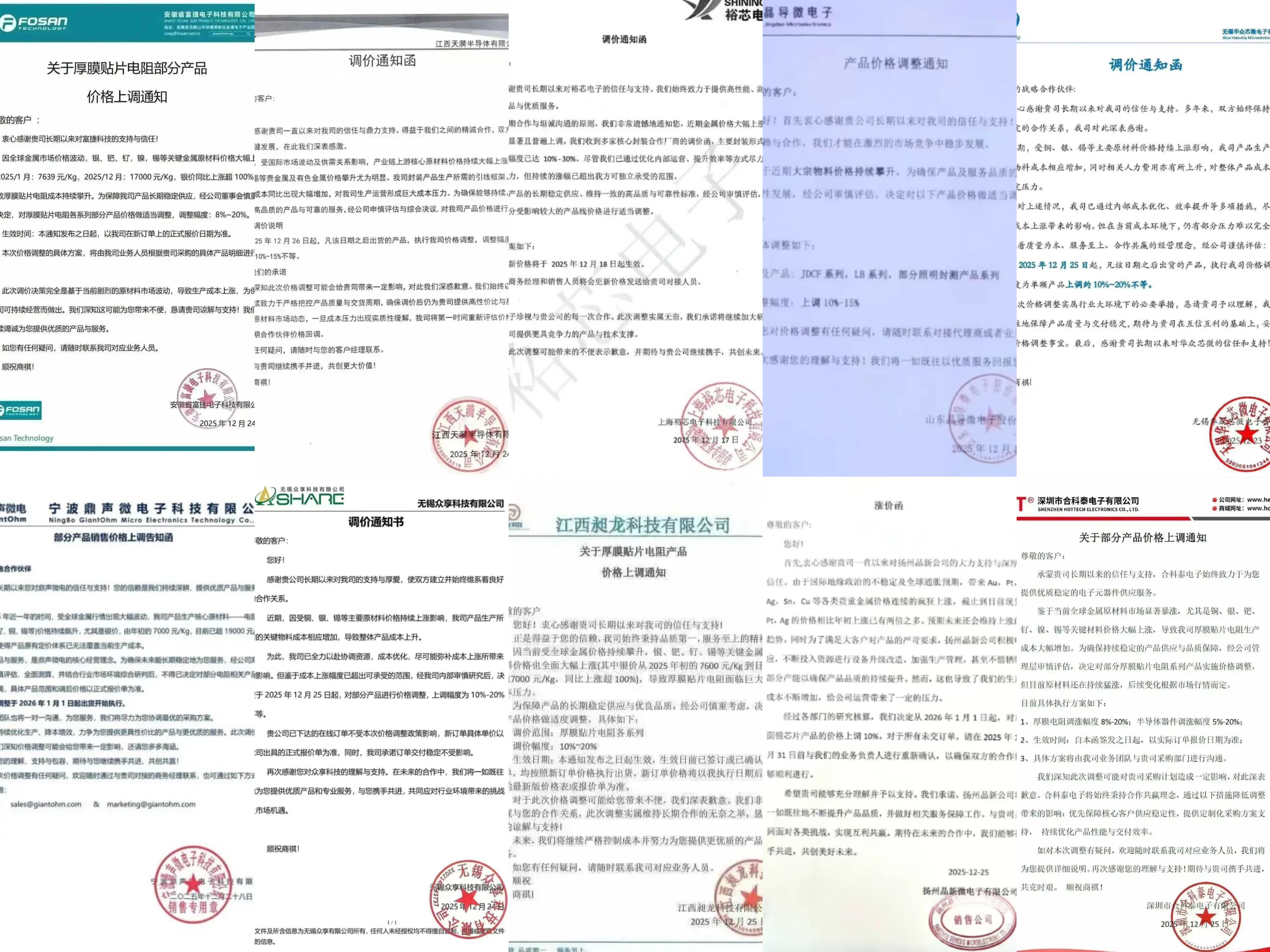 除上市公司外,众多中小企业也相继加入调价行列。厦门宏发、南充溢辉电子、浙江玖维电子、安徽富捷电子、宁波鼎声微电、江西昶龙科技及深圳合科泰电子等一批中小型厂商相继宣布调价,调整幅度普遍在5%-20%之间,覆盖了厚膜贴片电阻、特种晶片电阻及半导体器件等多个品类。