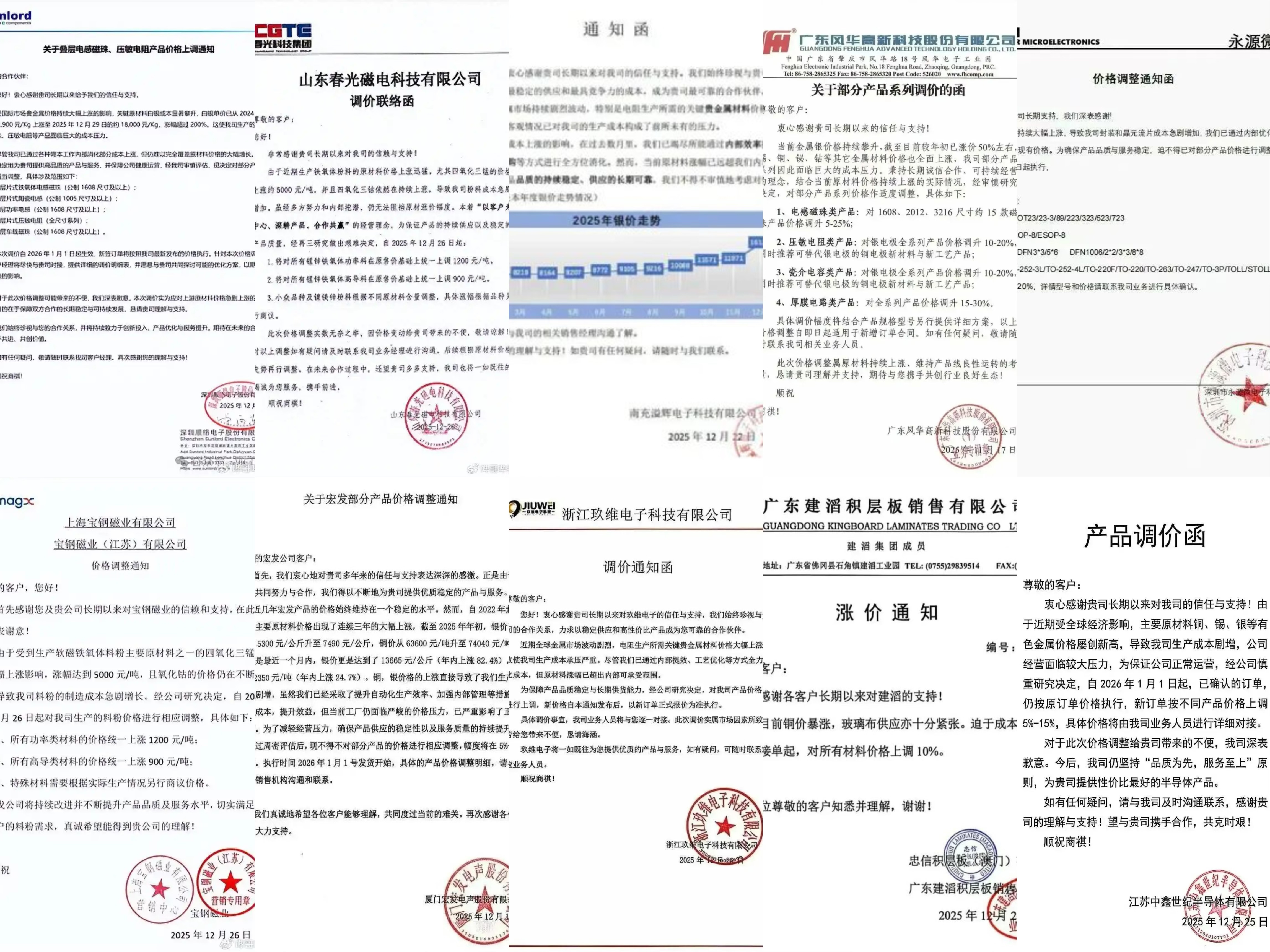 在磁性元件领域,头部企业率先启动价格调整机制。2025年12月29日,顺络电子发布涨价函,指出关键原材料白银价格已从2024年1月的约5900元/公斤上涨至2025年12月的约18000元/公斤,涨幅超过200%,对公司叠层电感磁珠、压敏电阻等产品造成显著成本压力。为此,公司决定自2026年1月1日起对部分相关产品进行价格上调。