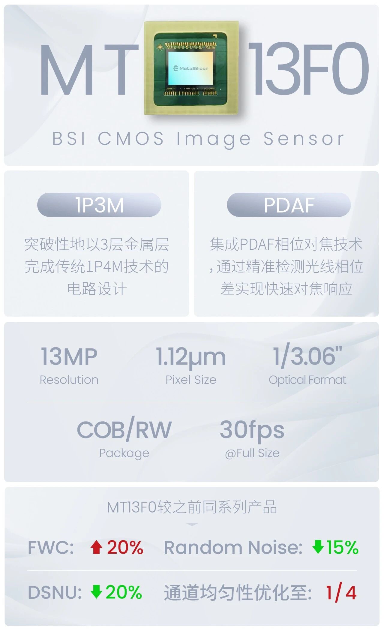 较之前同系列产品,MT13F0在性能上实现了全面跃升:FWC提升20%,Random Noise降低15%,DSNU降低20%,通道均匀性优化至1/4,从而能够呈现更细腻、更通透的影像画质。