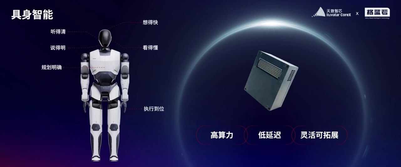 在具身智能领域,天数智芯与格蓝若机器人达成深度合作。彤央TY1100算力模组为具身机器人提供大脑,高算力,低延迟,灵活拓展的能力正好适合物理AI在机器人上的应用,让机器人真正具备具身意识。