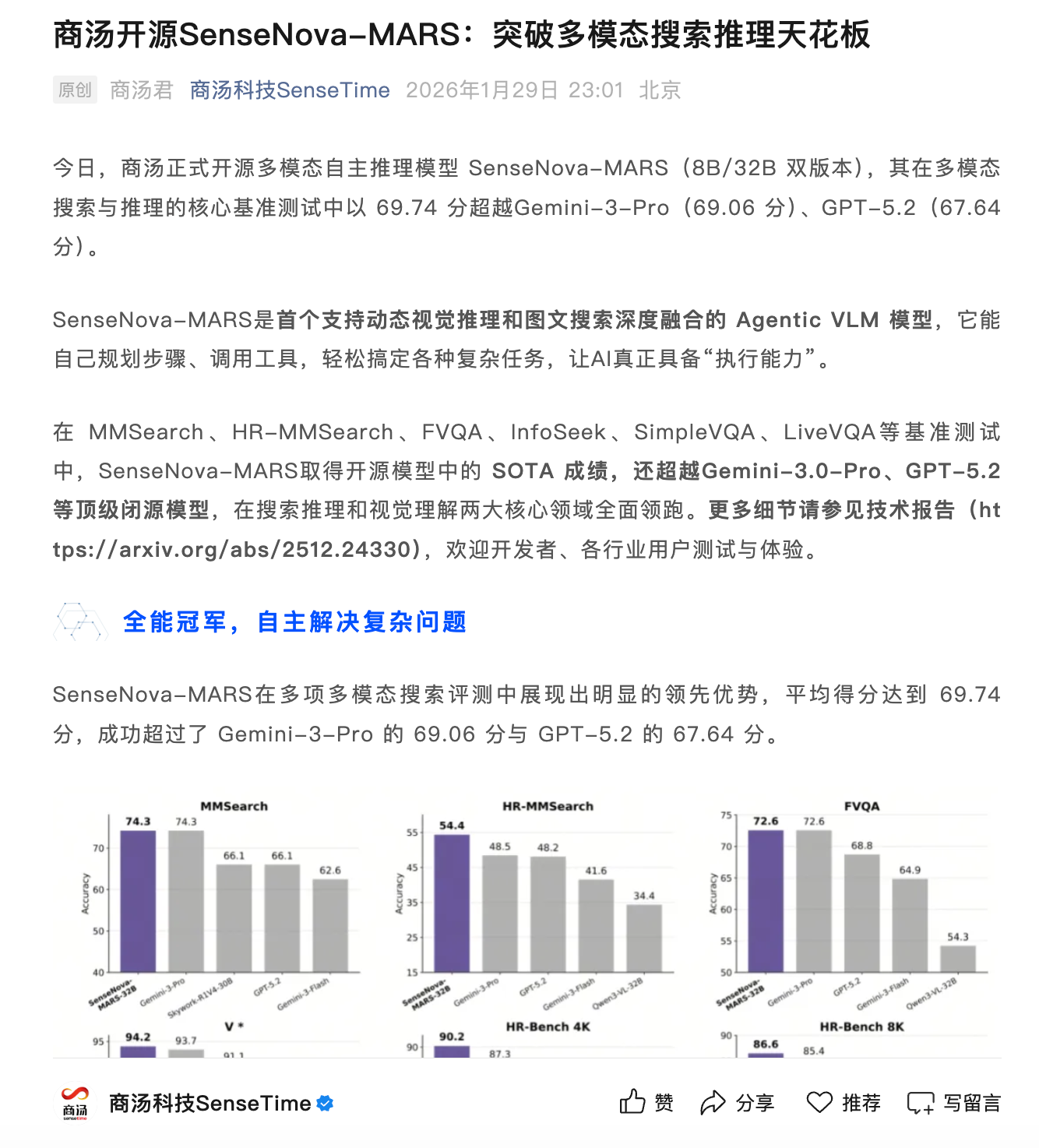 1月30日,商汤科技宣布开源其多模态自主推理模型SenseNova-MARS,提供8B与32B两个参数版本。据官方信息,该模型在多模态搜索与推理的基准测试中综合得分69.74,超过Gemini-3-Pro与GPT-5.2等模型。