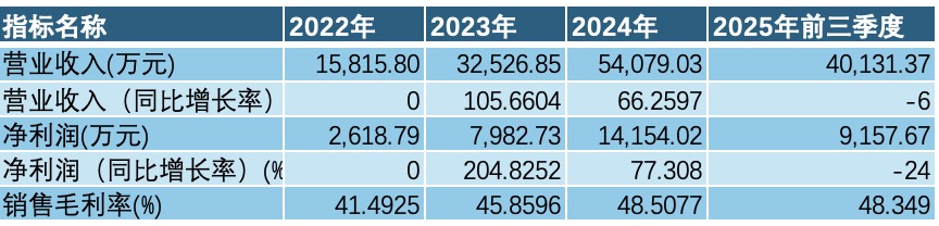 恒运昌的业绩呈现爆发式增长。2022年至2024年,公司营业收入从1.58亿元飙升至5.41亿元,年均复合增长率高达84.91%;归母净利润从2618.79万元增长至1.42亿元,增幅超过440%。仅2024年,营收与净利润便分别实现66.26%77.31% 的同比增长,增长势头迅猛。
