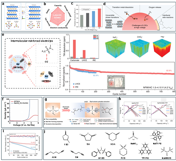 图2. 层状氧化物正极所面临的挑战及电解液改性策略、关键性能指标雷达图、充电截止电压与全电池能量密度的关系以及主要挑战。薛伟江课题组提出的分子间增强磺酰胺基电解液的溶剂化结构,及其对高电压钠离子软包电池中过渡金属溶解的拟制和界面稳定的机制(e)。