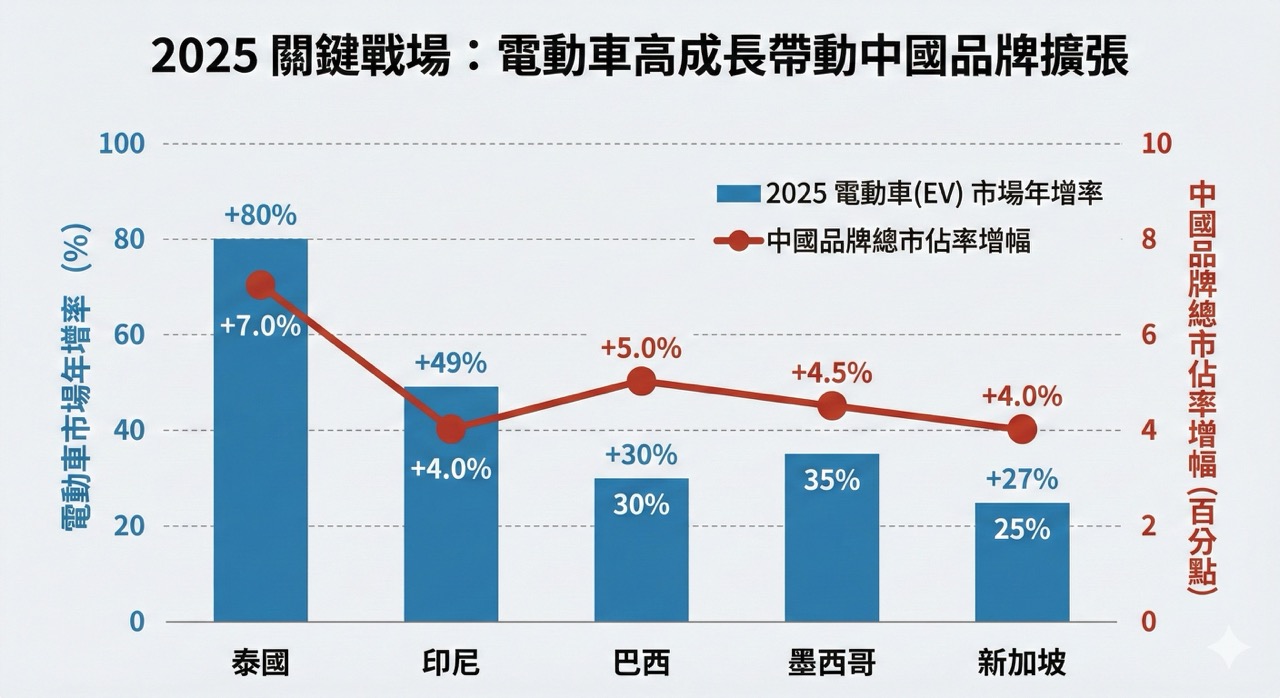 在太平洋另一边,巴西与墨西哥虽然不像东南亚几乎被日系车垄断,但日系车依然占据主导地位。 然而巴西正在积极引进中国纯电车与插电混动车,比亚迪的成长速度飙升,从2022年只有249辆,到2025年已经卖出11万辆,巴西预计今年还要进口20万辆中国制电动车,让中国车市占快速增加到10%以上,同时在巴西生产的第一辆比亚迪,也已经在2025年12月出厂,给日系车造成新的压力。