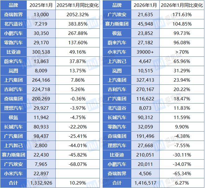 其他新势力方面,小米汽车1月实现超70%的同比增幅(对比2025年1月2.29万辆基数),上汽智己亦录得65.96%的同比增长。这些品牌通过智能化体验、用户运营和精准定价,在激烈竞争中持续扩大用户基本盘。