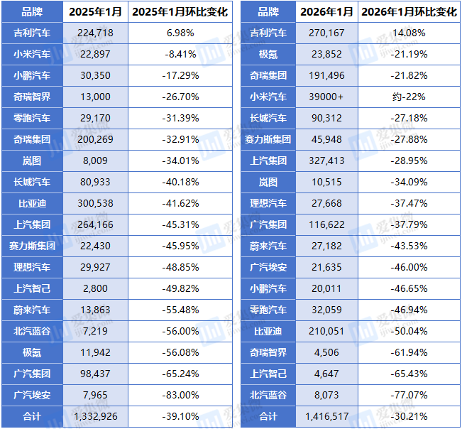 值得注意的是,吉利汽车成为本次统计中唯一实现环比正增长的车企,销量从2025年12月的23.68万辆增至2026年1月的27.02万辆,环比增长14.08%。这一逆势表现得益于其多品牌协同战略的有效执行、新能源产品矩阵的快速完善(如银河系列放量)以及春节期间精准的促销与交付保障,彰显出其体系化作战能力。