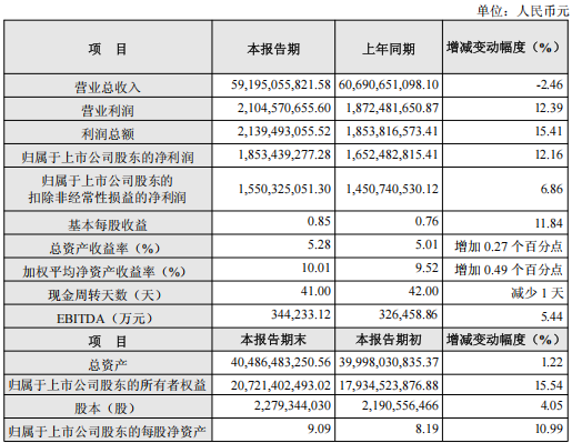 报告期内,公司销售费用、管理费用、研发费用及财务费用总额为38.66亿元,同比下降3.35%。其中,财务费用因利率下降同比减少14.16%,管理费用因加强管控同比减少5.71%。期间费用占营业收入比重为6.53%,较上年下降0.06个百分点。