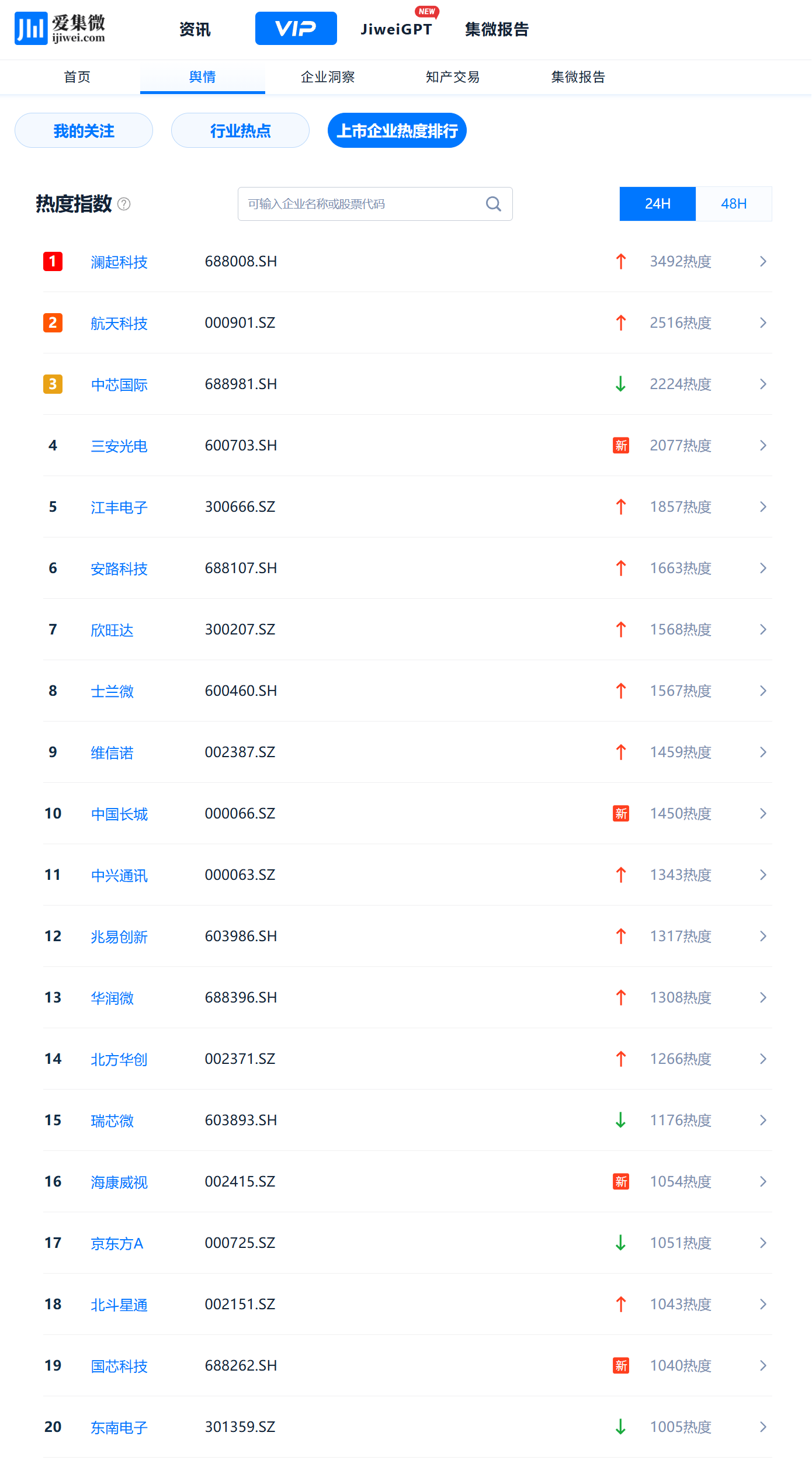 登录爱集微VIP频道,实时查看动态“上市企业热度排行”,穿透洞察每一个波动背后的驱动因素。