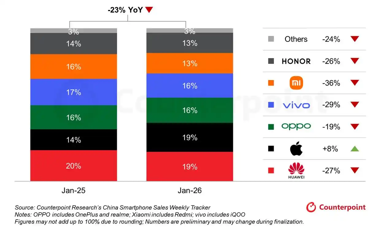 其他国产头部品牌均遭遇两位数下滑。小米(含 Redmi)下滑 36%、vivo(含 iQOO)下滑 29%、OPPO(含一加、realme)下滑 19%、荣耀下滑 26%,“Others” 品牌下滑 24%。Counterpoint 分析指出,核心症结在于 2025 年初补贴政策的 “透支效应”—— 去年 1 月补贴恰逢春节促销前置了需求,而 2026 年补贴力度减弱、消费需求疲软,对销量刺激有限。​