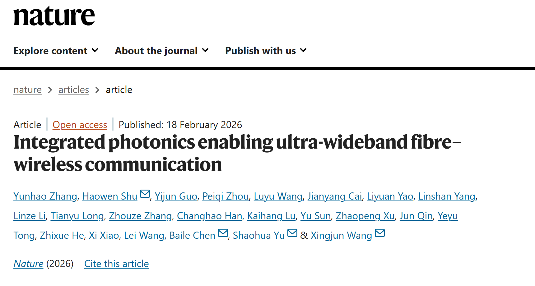 2026年2月18日,研究论文《集成光子学赋能超宽带光纤-无线通信》(“Integrated photonics enabling ultra-wideband fibre–wireless communication”)在线发表于国际顶尖学术期刊《自然》(Nature)。北京大学电子学院王兴军教授-舒浩文研究员团队与鹏城实验室余少华院士团队、上海科技大学陈佰乐副教授课题组、国家信息光电子创新中心肖希总经理团队等合作,在下一代无线通信(6G)及光通信领域取得突破性进展,在国际上首次提出了集成“光纤-无线融合通信”概念,率先实现了光纤和无线通信系统间的跨网络无缝融合。通过自研的超宽带光电融合集成芯片和AI赋能的先进均衡算法,该研究所研发的系统在电信通讯的所有主要场景中(包括光纤、无线及其混合链路)均能支持创世界纪录的数据传输速率,实现“一套系统、跨场景复用”。