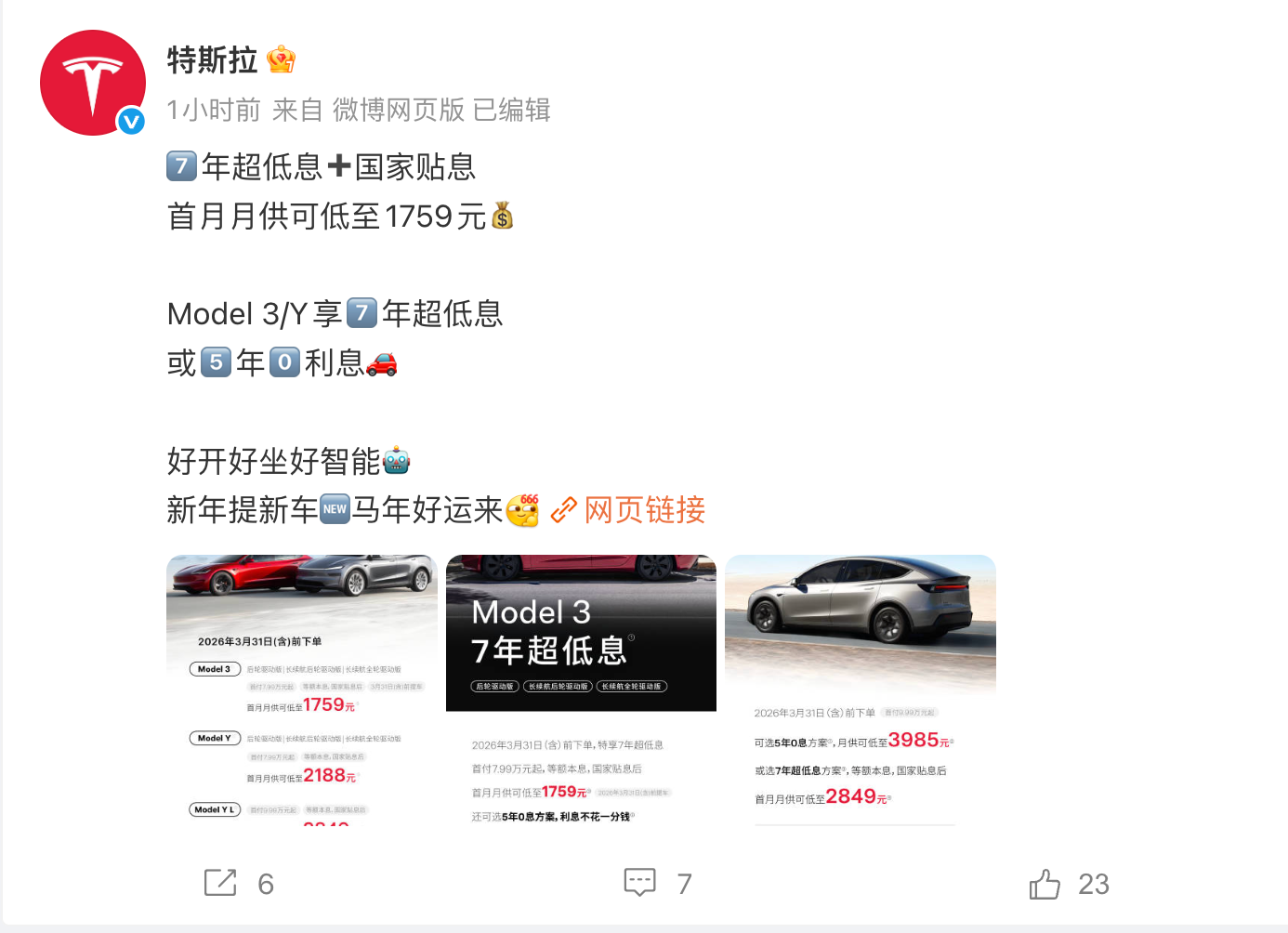 2月26日,特斯拉中国官宣,在3月31日前下单,全系车型均可享受7年超低息贷款。具体来看,Model 3首付7.99万起,月供可低至1759元;Model Y首付7.99万起,月供可低至2188元;Model Y L首付9.99万起,月供可低至2849元;以上三款车型还均可选择5年0息方案,贷款购车不用任何利息。