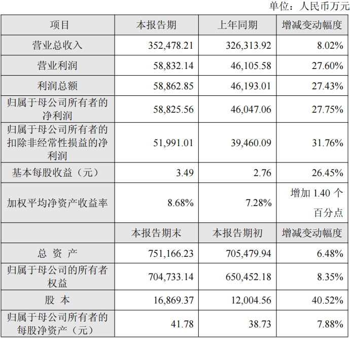 截至报告期末,公司总资产为751,166.23万元,较报告期初增长6.48%;归属于母公司的所有者权益为704,733.14万元,较报告期初增长8.35%。