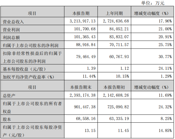 截至2025年末,公司总资产为2,393,174.38万元,较期初增长11.69%;归属于上市公司股东的所有者权益为901,447.38万元,较期初增长24.32%;归属于上市公司股东的每股净资产为13.15元/股,较期初增长14.85%。股本为68,558.16万股,较期初增长8.25%。