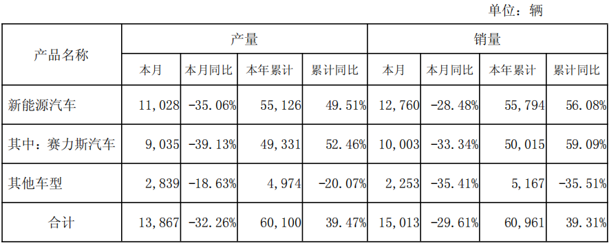 赛力斯集团股份有限公司(证券代码:601127)3月3日发布2026年2月份产销快报。公告显示,公司2月新能源汽车销量为12,760辆,同比减少28.48%;本年累计销量55,794辆,同比增长56.08%。