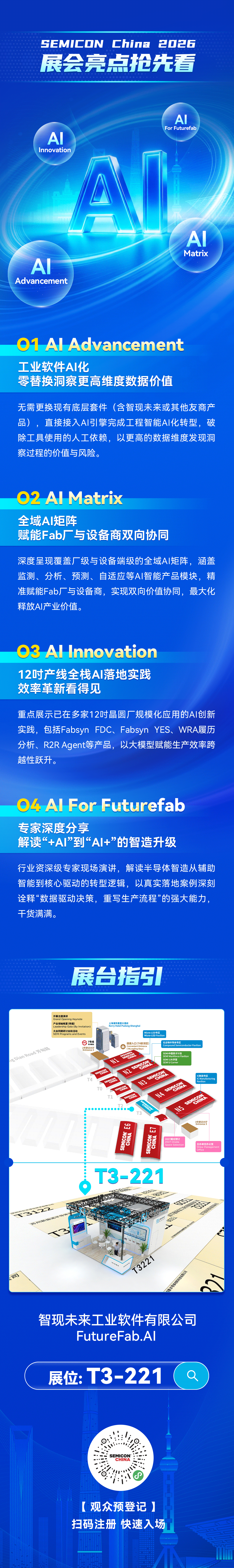 诚邀各位行业同仁、技术伙伴与生态盟友莅临T3-221展位,共同探讨半导体AI落地的创新路径,共话产业智能升级的未来图景。
