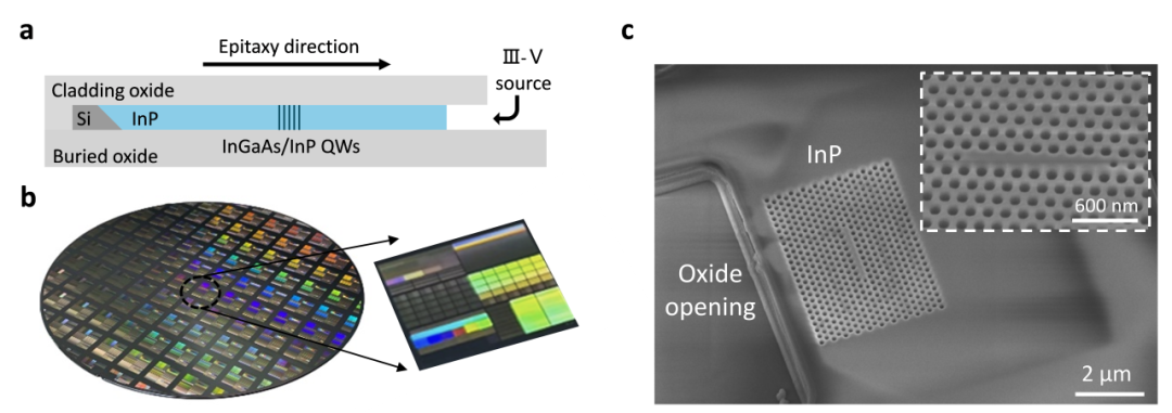 III-V族化合物半导体光子晶体激光器凭借小尺寸和低功耗的特点,在未来片上光互连系统中拥有巨大应用潜力。以传统垂直外延方式生长制备的光子晶体激光器虽实现了优异性能,但光子晶体薄膜的制备需要复杂的衬底掏空或者薄膜转移工艺,器件结构稳定性差。同时,水平的量子阱光增益层通常布满整个腔体,被刻蚀气孔穿透后载流子非辐射复合显著增加,泵浦效率难以提高。中山大学韩羽副教授、余思远教授团队将整个过程空间旋转90度,利用“水平侧向选区外延”直接生长包含掩埋式竖直量子阱的磷化铟(InP)薄膜、并将量子阱精准放置在激光器微腔的模场最强点而不被与其平行的气孔穿透,完美避免了传统垂直外延方案的两个关键限制,实现了SOI晶圆上与硅波导层同一平面单片集成的通信波段光子晶体激光器。该工作建立了一整套制备硅基单片集成半导体激光器的创新方法,为未来高密度片上光互连系统提供了单片集成高效率光子晶体激光器的解决方案。