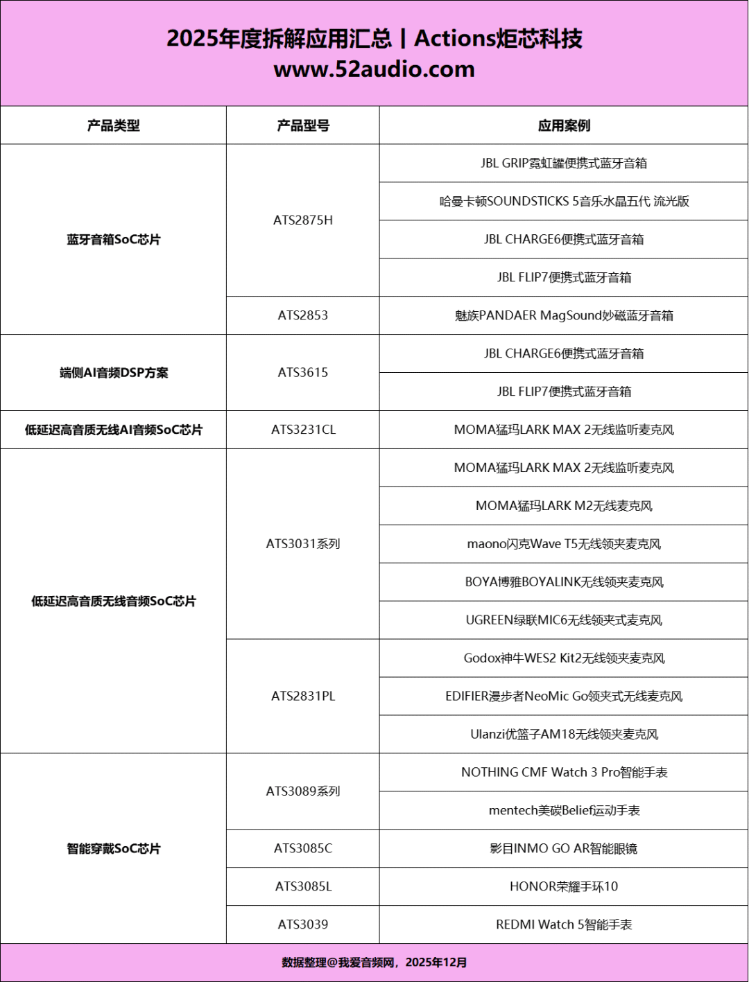 根据我爱音频网2025年度拆解报告:2025年,包括国际一线音频品牌在内的15大知名品牌,旗下共计18款热销AIoT产品不约而同地采用了炬芯科技的解决方案。这些产品覆盖了蓝牙音箱、无线领夹麦克风、智能眼镜、智能手表/手环等多个快速增长的市场领域。