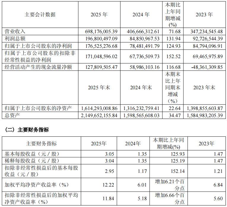截至2025年12月末,公司总资产达214,965.22万元,较上年末增长34.47%;归属于上市公司股东的净资产161,429.30万元,同比增长22.64%,资产规模与财务实力进一步增强。经营活动产生的现金流量净额为12,780.95万元,同比增长116.68%,现金流状况良好,为公司持续发展提供坚实支撑。