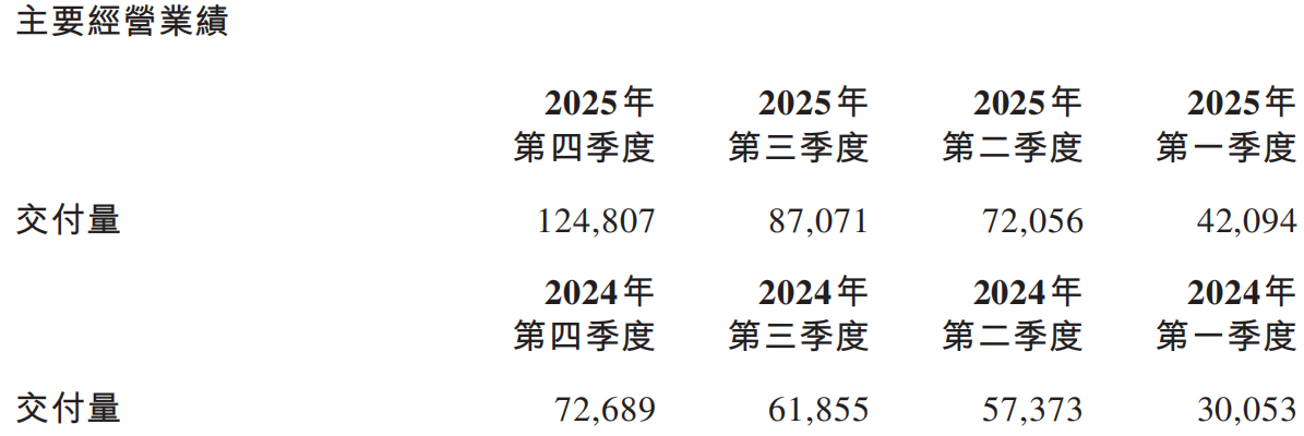 在交付端,蔚来展现出强劲的增长势头。2025年第四季度汽车交付量达124,807辆,较2024年第四季度增长71.7%、较2025年第三季度增长43.3%,其中蔚来品牌67,433辆、乐道品牌38,290辆、萤火虫品牌19,084辆,各品牌在细分市场均表现亮眼。