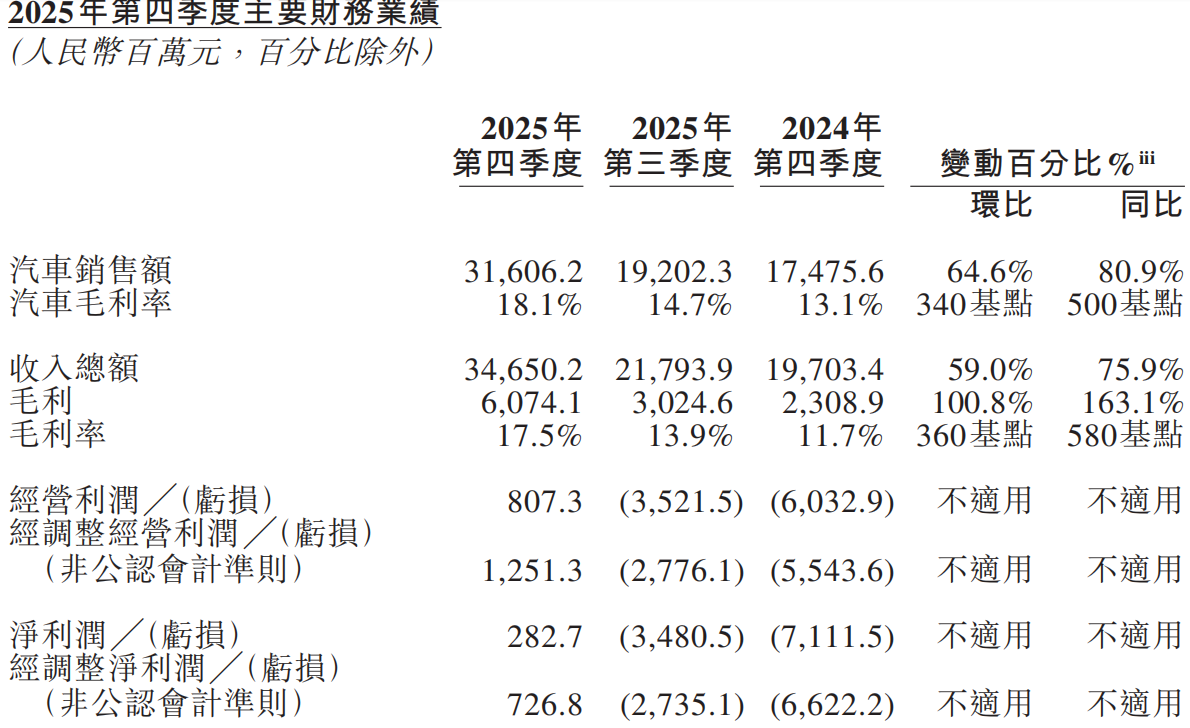 更为关键的是,蔚来四季度首次实现单季度经营盈利与净利润转正:经营利润达8.073亿元(1.154亿美元),而2024年四季度为经营亏损60.329亿元、2025年三季度为经营亏损35.215亿元;扣除股权激励费用后的经调整经营利润(非公认会计准则)为12.513亿元(1.789亿美元),实现重大突破。四季度净利润达2.827亿元(0.404亿美元),经调整净利润(非公认会计准则)为7.268亿元(1.039亿美元),盈利表现超预期。