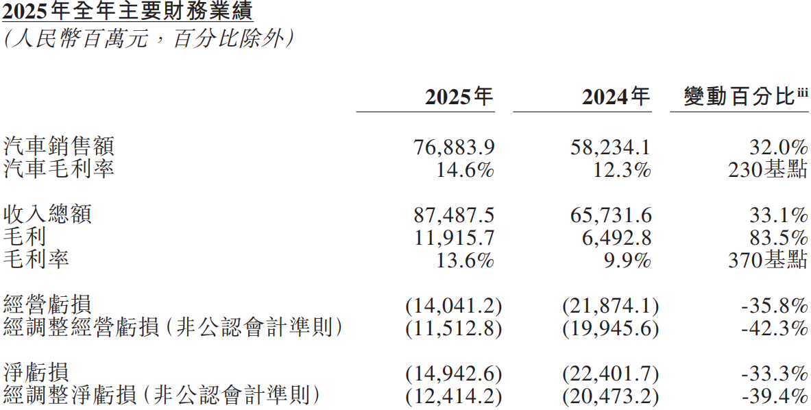 2025年全年,蔚来财务指标全面改善。全年收入总额874.875亿元(125.105亿美元),同比增长33.1%;汽车销售额768.839亿元(109.942亿美元),同比增长32.0%;其他销售额106.036亿元(15.163亿美元),同比增长41.4%,二手車销售、技术研发服务及售后相关收入成为重要增长极。全年汽车毛利率14.6%,同比提升230个基点;整体毛利率13.6%,同比提升370个基点;毛利119.157亿元(17.039亿美元),同比大幅增长83.5%。尽管全年仍为经营亏损与净亏损状态,但亏损规模大幅收窄:经营亏损140.412亿元(20.079亿美元),同比下降35.8%;净亏损149.426亿元(21.368亿美元),同比下降33.3%;经调整经营亏损与经调整净亏损分别同比下降42.3%、39.4%,企业经营效率持续提升。
