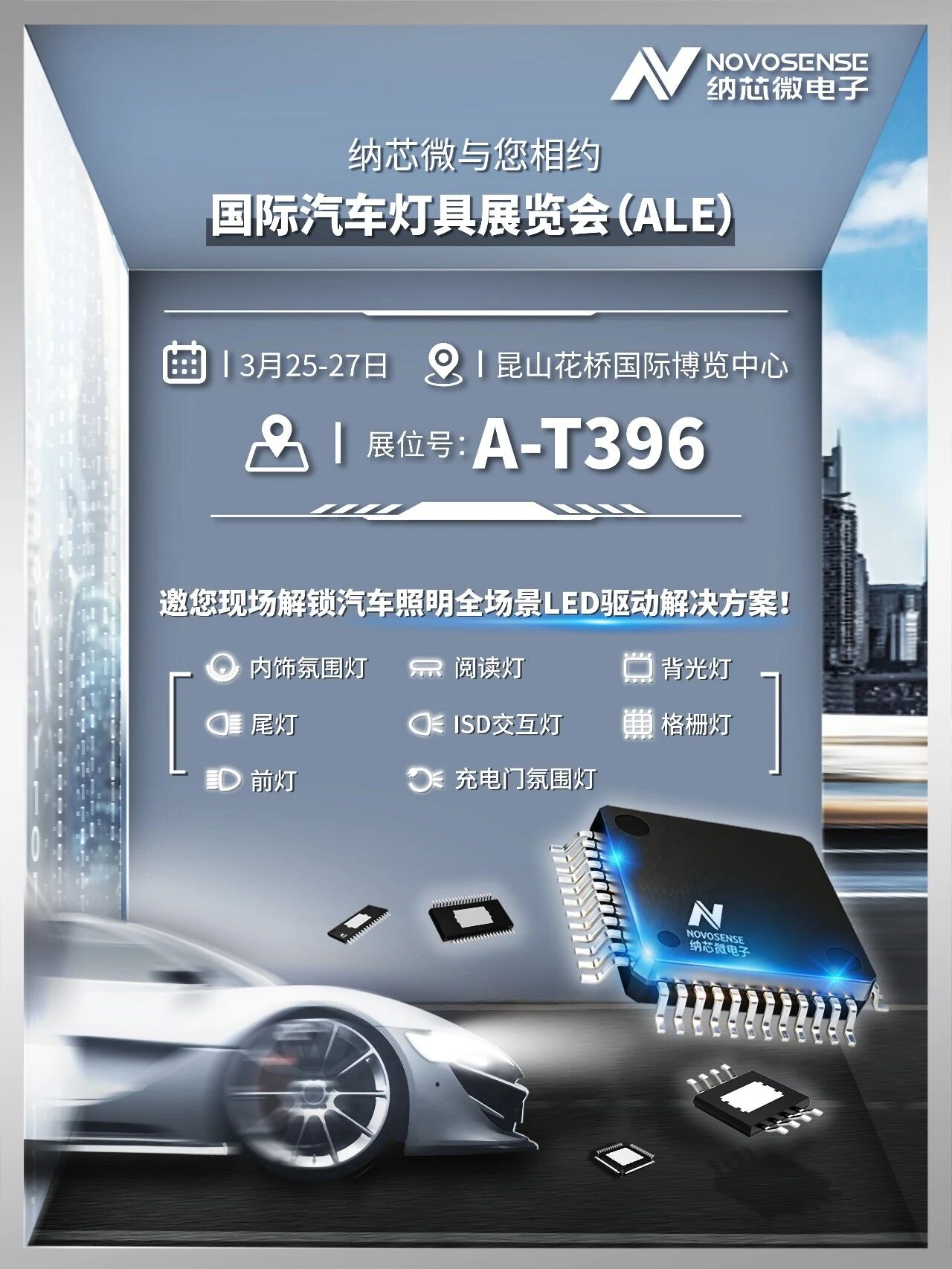 诚邀您前往昆山花桥国际博览中心A馆 A-T396 展位, 与纳芯微技术团队面对面交流,深入了解汽车照明系统在智能化与个性化趋势下的最新技术与应用方案。