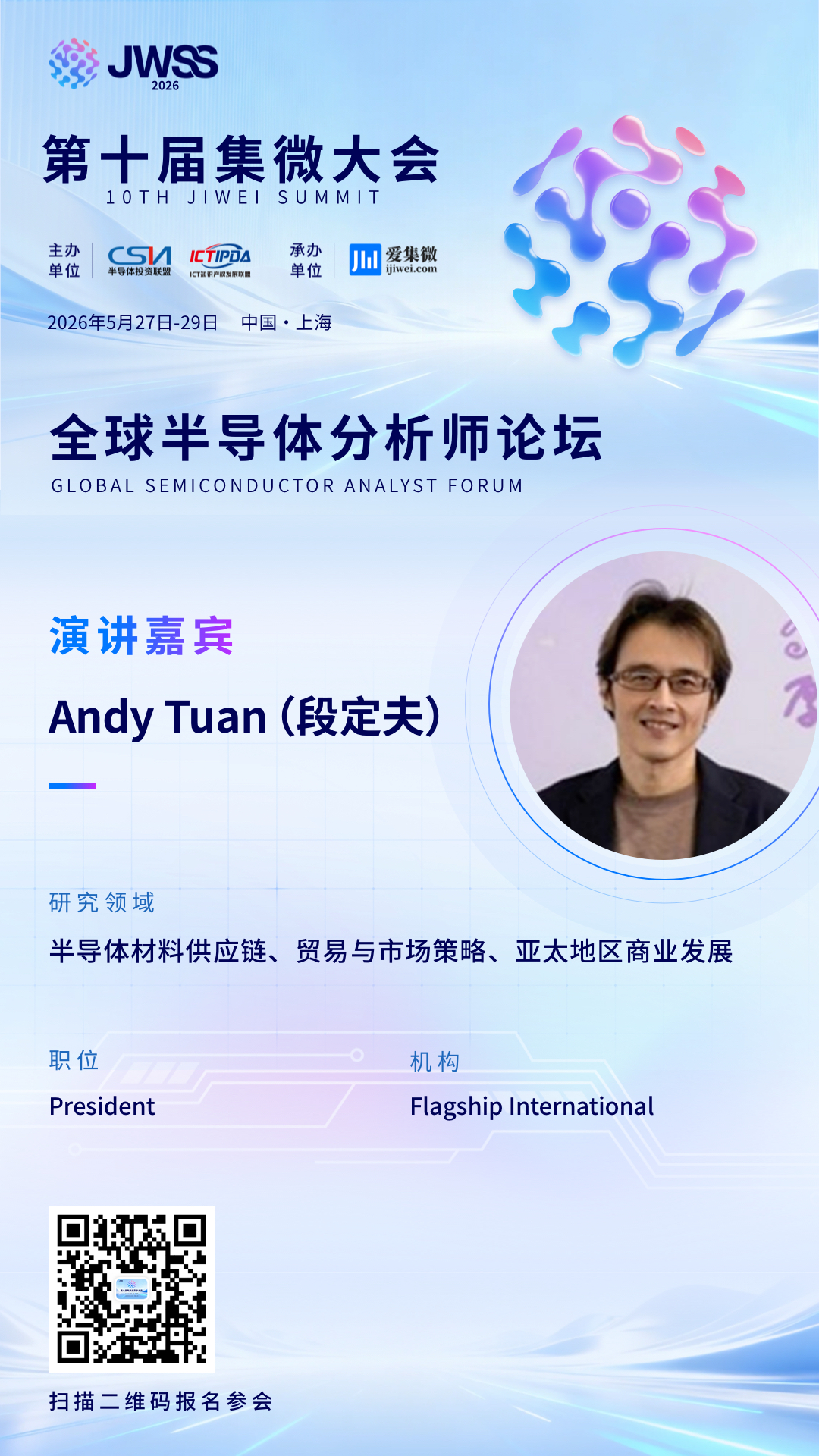 在本届论坛上,Andy Tuan将围绕“半导体材料供应链发展趋势”这一主题展开分享,深入剖析当前全球半导体材料供需格局的演变逻辑,解读关键材料领域的技术突破与国产替代进程;研判在地缘变局与产业链区域化趋势下,材料环节的供应链韧性与协同发展方向。最后,他还将结合多年产业实践,前瞻性探讨半导体材料未来几年的技术演进路径与市场格局重塑的可能性。