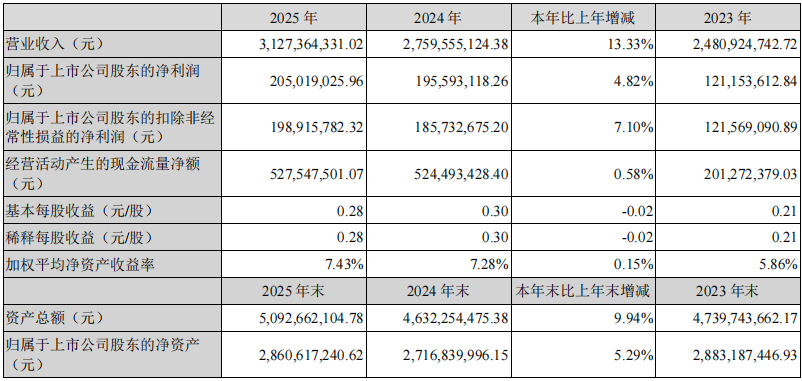 截至2025年末,公司总资产为50.93亿元,较上年末增长9.94%;归属于上市公司股东的净资产为28.61亿元,较上年末增长5.29%。资产负债率为43.83%,较上年末下降0.71个百分点。货币资金为13.27亿元,较上年末下降14.56%。