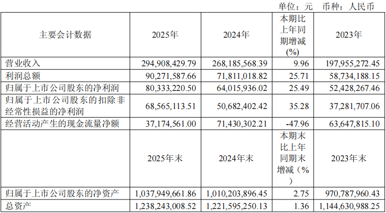 截至2025年末,公司总资产为12.38亿元,较上年末增长1.36%;归属于上市公司股东的净资产为10.38亿元,较上年末增长2.75%。资产负债率为16.18%,较上年末下降1.14个百分点。货币资金为1.22亿元,较上年末下降79.42%,主要系公司为提高闲置资金使用效率,利用闲置资金购买理财产品所致。交易性金融资产为6.60亿元,同比增长172.73%。