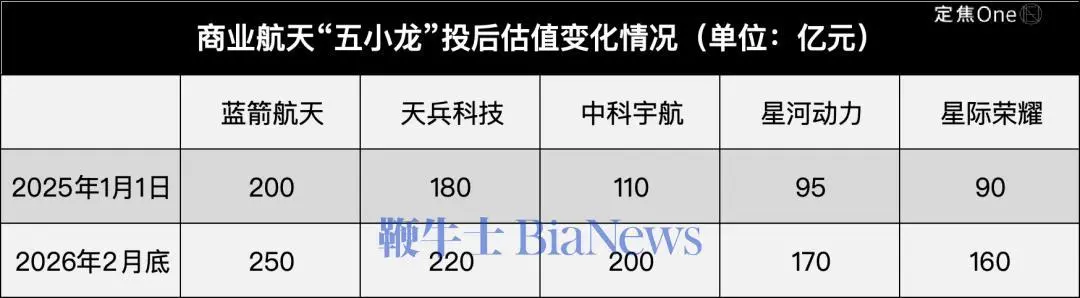 「定焦One」结合多位参与商业航天一级市场融资的投资人所提供的信息,五家公司在今年2月底的投后总估值已经至少达到1000亿元,一年多时间增长超325亿元,平均每家的估值增加65亿元。