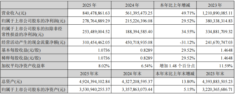 融捷股份3月23日发布2025年年度报告。报告显示,公司2025年实现营业收入8.4亿元,同比增长49.71%;归属于上市公司股东的净利润为2.79亿元,同比增长29.52%;扣非净利润为2.53亿元,同比增长34.55%。
