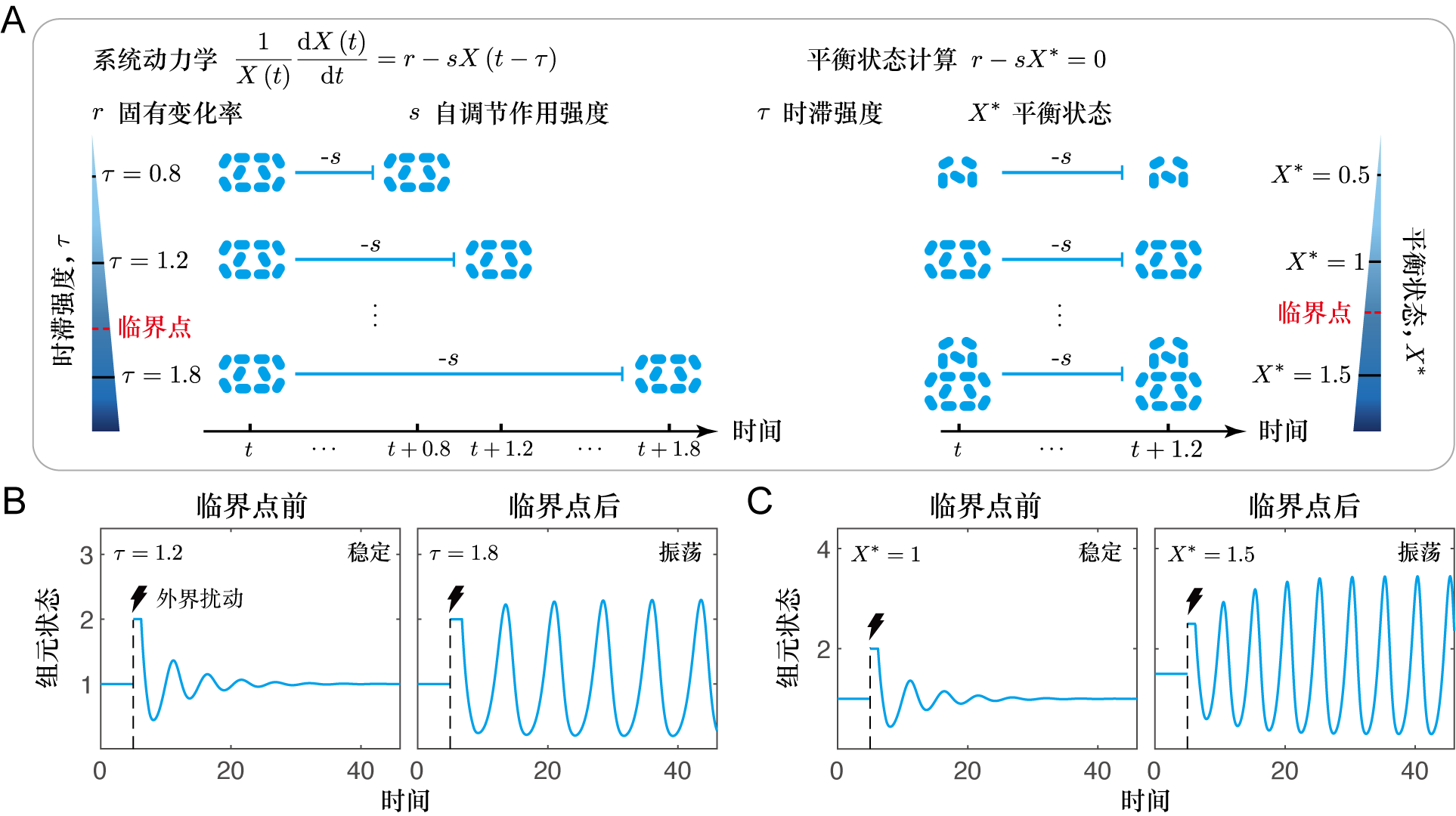 传统临界转变的理论研究通常假设系统组成单元之间的交互是即时的,即任一组成单元的变化会立刻对其交互对象产生影响。不同于这一假设,在真实系统中,由于组成单元之间的作用传递、信息处理与状态响应等过程,时间延迟(即时滞)效应普遍存在:组成单元一般需要一定时间才能感知并响应其交互对象的状态变化。时滞的存在可诱发极限环振荡、混沌等复杂动力学行为,会对系统功能及临界转变产生结构性影响。同时,在临界转变机理分析中引入时滞,会使系统特征方程由代数方程转变为超越方程;而系统中数量众多的组成单元则会带来高维度的状态矩阵。二者的综合作用将大幅提高作为临界转变分析基础的特征方程的求解复杂度,从而限制对临界转变机理的深入分析。